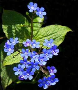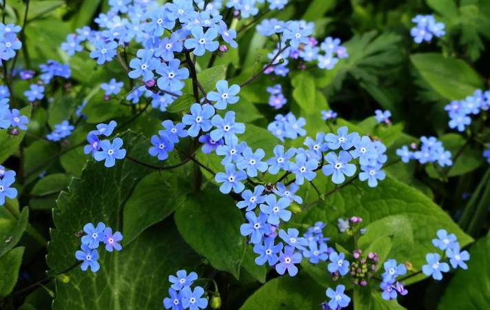 Бруннера сибирская. Растение довольно крупное, высотой до 60 см. Очень выносливо, в том числе прекрасно растет в тени. Образует заросли. Цветки темно-голубые с белым глазком, собраны в метельчатые соцветия. Цветет продолжительно (почти месяц) и обильно.
