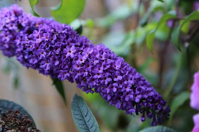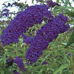 Буддлея Empire Blue (Эмпайр Блю). Раскидистый кустарник с поникающими ветвями, высота 1,5-2,5 м, ширина 2 м. Цветки темно-синие, очень ароматные, собраны в крупные соцветия до 30 см длиной. В период цветения буддлея окружена бабочками, шмелями и пчелами. Цветет от июля до октября.