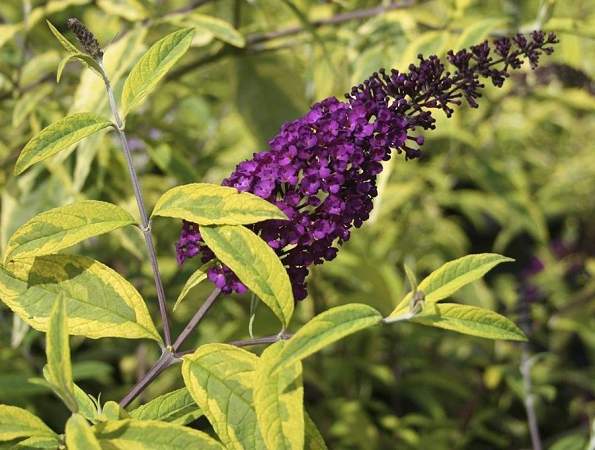 Буддлея Santana (Сантана). Необычный сорт с вариегатными листьями и темно-пурпурными соцветиями-свечками. Листья зеленые с желтой каймой. Кустарник относительно невысокий, 150 см. Цвести начинает с трехлетнего возраста. Обладает тонким, сладким, пряным ароматом. Является отличным медоносом. Цветки розовые, очень ароматные, собраны в крупные соцветия до 30 см длиной, окружаемые бабочками. Цветение с июля до октября.