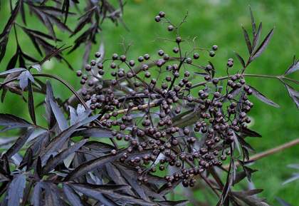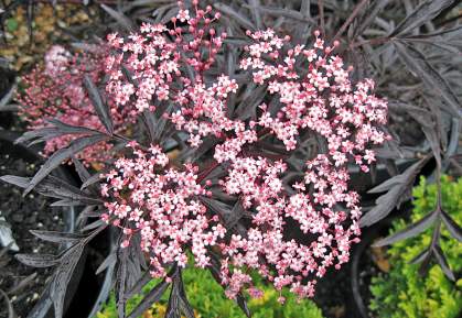 Бузина Black Lace (Блэк Лэйс). Листва тёмно-пурпурная, сильно рассечённая. Цвет соцветий — розовый. Плоды чёрные. Высота куста 1,5-2 м. Ширина 1,2-1,5 м. Значения размеров растения указаны примерно в возрасте 10 лет.