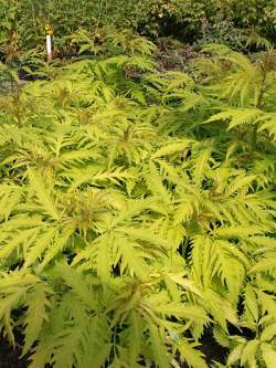 Высокодекоративный кустарник, компактный, густой, высотой и шириной около 1,5 м. Листья сложные. Листочки зубчатые, глубоко-рассечённые, весной ярко-жёлтые, затем зеленеют. Молодые побеги с бронзово-красным оттенком. Цветки кремово-белые, в соцветиях.