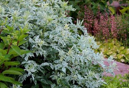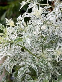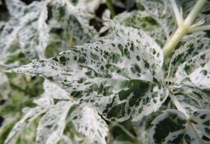 Бузина Pulverulenta (Пулвирулента). Необычный вид придают большие белые пятна на листьях, которые могут достигать таких размеров, что издалека кажутся белоснежными цветами, покрывающими кустарник. Настоящие цветы у этой бузины, действительно, белые, но имеют желтоватый оттенок. Эта бузина любит щелочные почвы, но в остальном к составу не требовательна. Ее листья часто привлекают тлей, поэтому уход за Pulverulenta (Пулвирулента) включает в себя и обработку специальными препаратами. Сажать эту бузину нужно в полутенистых местах, так как прямые солнечные лучи могут причинять ожоги, особенно во время засухи. Полную тень Pulverulenta (Пулвирулента) тоже переносит неплохо, хотя растет в таких местах медленнее.