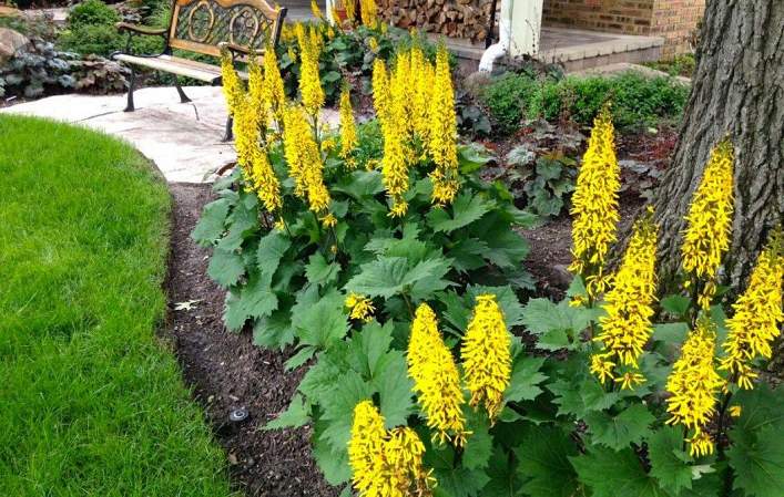 Бузульник Bottle Rocket (Ботл Рокет). Отличный сорт бузульника - компактный, с красивыми темными листьями. Цветение обильное, соцветия-свечи плотные, из мелких желтых цветков. Соцветия в середине немного утолщаются, поэтому становятся похожи на бутылки, отсюда и название сорта. Высота 80 см.