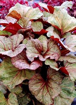 Бузульник Garden Confetti (Гарден Конфетти). Эффектный многолетник для полутенистой зоны. Листья большие сердцевидные, пёстрые, с лаймовыми, зелёными и розовыми пятнами на кремовом фоне весной и на жёлтом фоне летом. Прожилки и обратная сторона листьев тёмно-красная. Цветки жёлтые ромашковидные. Предпочитает влажную дренированную почву. Не терпит длительной сухости почвы.