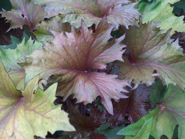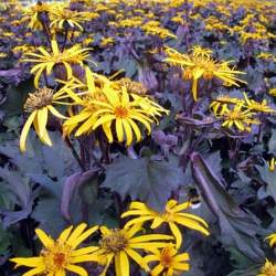 Бузульник Osiris Cafe Noir (Осирис Кафе Нуар). Листья толстые, эластичные, с очень глубоко зазубренной волнистой каймой, вначале чёрно-фиолетовые, затем с бронзовыми оттенками, к концу сезона оливково-зелёные. Цветки золотисто-жёлтые, стебли пурпурно-красные.