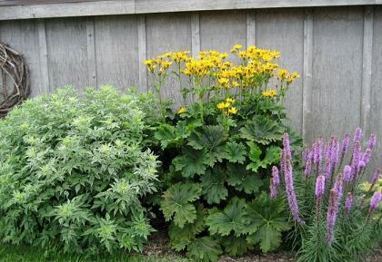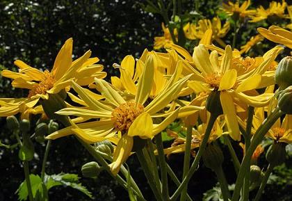 Бузульник пальчатолопастный. Монументальное растение. Гибрид между бузульниками зубчатым и японским (L. dentata х L. japonica.) Куст мощный, но рыхлый. Листья — красивые крупные, овально-почковидные, края глубоко изрезаны. Соцветие — щиток из десятка крупных насыщенно-желтых "ромашек".