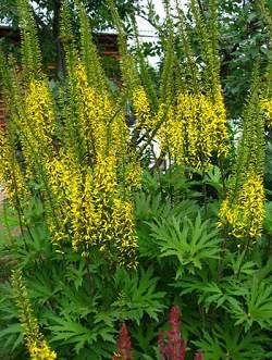 Бузульник Пржевальского. Отличается изящными, сильно разрезанными остропальчатыми листьями на тонких красно-коричневых черешках. Корзинки мелкие, желтые, собраны в колосовидные, узкие соцветия до 50-70 см длиной, верхушки которых слегка обвисают.