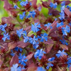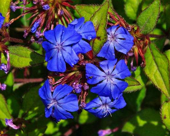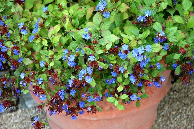 Цератостигма плюмбаговидная. Растение представляет собой листопадный кустарничек 20-30 см в высоту с жесткими побегами. Листочки блестящие, сверху ярко-зеленые и сизые с обратной стороны листа. Разрастаясь, плюмбаго формирует красивый и густой ковер со стелющимися побегами. В конце августа на кустиках обильно расцветают ярко-голубые или синие цветочки, похожие на цветочки флоксов. Цветение длится до самых морозов.