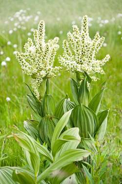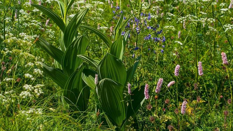 Чемерица белая. На открытых полянах, пойменных лугах, в долинах рек и ручьев можно встретить необычное растение, резко выделяющееся среди остального разнотравья своим монументальным и величественным видом. Высотой не меньше метра, а часто и гораздо выше, с крупными овально-продолговатыми гофрированными листьями оно становится особенно красивым в пору цветения. В это время выдвигаются высокие цветоносы, несущие кисти белых, зеленоватых или темно-бордовых цветков.