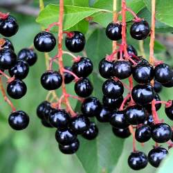 Черёмуха кистевая (обыкновенная) Чёрный блеск. Сорт гибридной черемухи среднераннего срока созревания. Дерево высотой 5-6 м, с густой широко-пирамидальной кроной, самобесплодное, с умеренно периодическим плодоношением. Соцветия — из 35-40 крупных цветков.