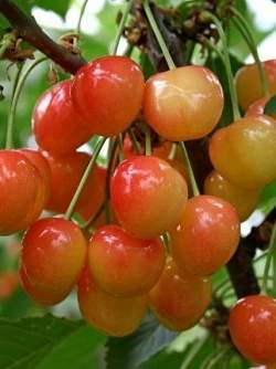 Плоды этого сорта небольшие, все одинаковой величины, очень аккуратные и плотные. По мере созревания бледно-желтая поверхность кожицы покрывается ярким оранжево-красным румянцем, постепенно черешня вся окрашивается в нежный светло-розовый цвет. Внутри находится легко отделяющаяся небольшая косточка и очень сочная хрящеватая мякоть, прекрасная на вкус, сладкая, ароматная.
