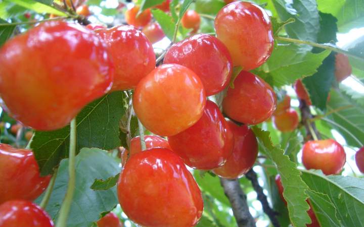 Плоды этого сорта небольшие, все одинаковой величины, очень аккуратные и плотные. По мере созревания бледно-желтая поверхность кожицы покрывается ярким оранжево-красным румянцем, постепенно черешня вся окрашивается в нежный светло-розовый цвет. Внутри находится легко отделяющаяся небольшая косточка и очень сочная хрящеватая мякоть, прекрасная на вкус, сладкая, ароматная.