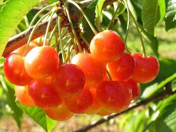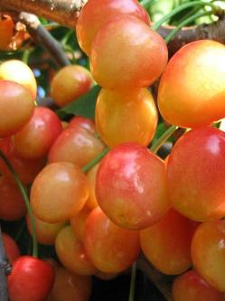 Черешня Соперница.Дерево — невысокое, крона пирамидальная. Листья на ветвях средней густоты. Цвет плодов — желтый с красно-розовыми вкраплениями. Янтарная мякоть не плотная, характеризуется высокой лежкостью. Форма — сердцевидная, сок плодов — бесцветный. От косточки отделяется хорошо. Черешки черешни расположены в виде зонтика, от плодов отделяются легко. На вкус мякоть сочная, медовая, кислинки практически нет.
