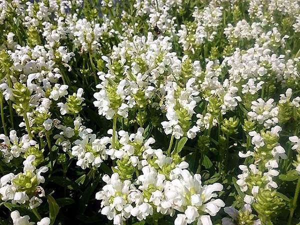 Черноголовка крупноцветковая Alba (Альба). Почвопокровный низкорослый многолетник. Высота до 30 см. Листья темно-зеленый. Цветки светло-лиловые, почти белые, собраны в соцветия. Цветение в июне-августе, обильное.