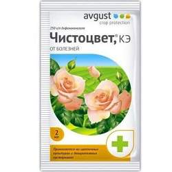 Чистоцвет (2 мл). Эффективное средство для защиты цветочных и декоративных культур от комплекса болезней. Характеризуется длительным профилактическим и выраженным лечебным свойствами. Обладает системным действием и обеспечивает защиту растений до двух недель. Проникает в растения через 2 часа после обработки и не смывается дождем.