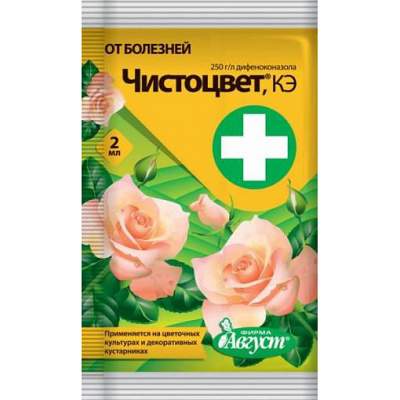 Чистоцвет — эффективное средство для защиты цветочных культур и декоративных кустарников от болезней. Фунгицид. Эффективен в борьбе с мучнистой росой, серой гнилью и пятнистостями. Обладает системным действием и обеспечивает защиту растений до двух недель. Проникает в растения через 2 часа и не смывается дождем.