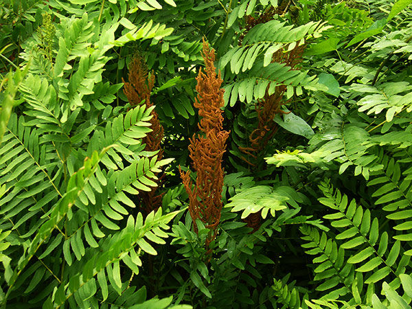 Чистоуст королевский, или Осмунда королевская. Красивый, редкий, мощный папоротник! Крупный куст (до 200 см) с блестящими плотными листьями. Весной листья красноватые, затем светло-зеленые, а осенью — золотистые.