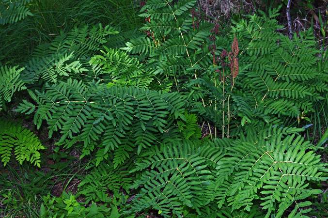 Чистоуст величавый (королевский), Осмунда. Красивый мощный папоротник! Крупный куст (до 200 см) с блестящими плотными листьями. Весной листья красноватые, затем светло-зеленые, а осенью — золотистые.