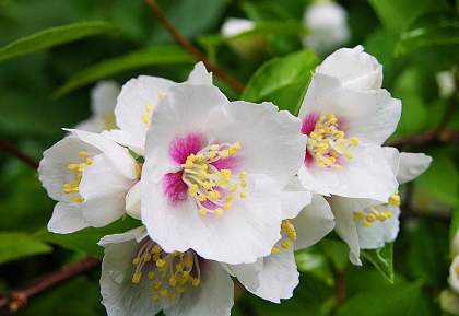 Чубушник Лемуана Belle Etoile (Бэль Этуаль). Куст высотой 1,5-1,8 м, шириной 1,5-1,8 м (данные для десятилетнего растения). Цветки белые с ярко-розовым глазком, простые, очень привлекательные. Имеет сильный земляничный аромат.