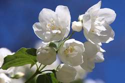 Чубушник Dame Blanche (Дам Бланш). Куст с пряморастущими побегами. Цветки около 2 см, простые и полумахровые, собранные в соцветия, очень ароматные.