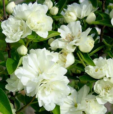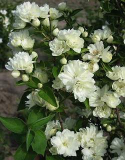 Чубушник Лунный Свет. Кустарник с красноватыми побегами, невысокий, компактный. Цветки изящные, махровые, зеленовато-кремовые, с тонким земляничным ароматом, в соцветиях по 3 шт.