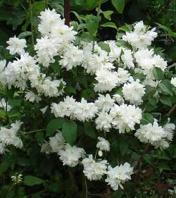 Чубушник гибридный Русалка. Эффектный махровый сорт. Куст высотой до 2 м. Побеги мощные и прямые. Листья крупные, темно-зеленые. Цветки белые, 2,5 см, махровые, собраны по 5-7 штук, ароматные. Лепестки многочисленные, узкие, заостренные. Цветы распускаются в начале июня, цветение очень обильное. Растет быстро.