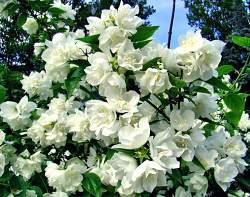 Чубушник Салют. Куст высокий, раскидистый. Цветки белые, махровые, изящные, состоят из узких в центре и широких по краям лепестков, собраны в кисти на концах многочисленных ветвей. Аромат тонкий. Зимостойкий, морозостойкий. Солнцелюбив, но может переносить легкую тень. Предпочитает плодородные свежие почвы, не выносят близкого стояния грунтовых вод.