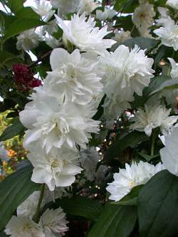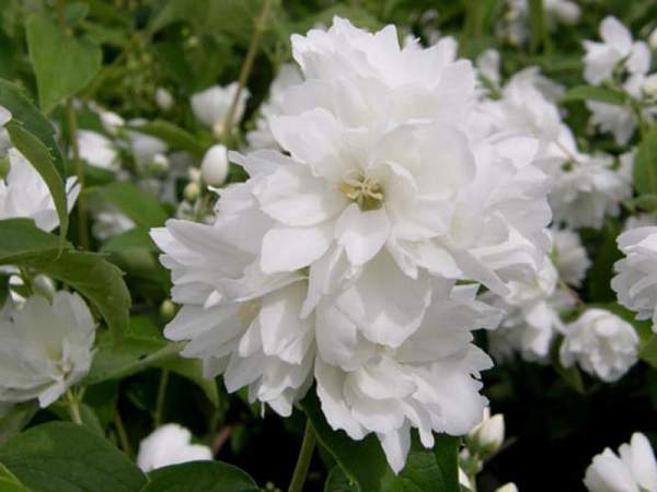 Чубушник Schneesturm (Шнеештурм). Куст высотой 1,5-3 м, шириной 1,5-2 м (данные для десятилетнего растения). Цветки белые, крупные, махровые диаметром до 4 см, практически без запаха. Соцветия очень плотные и обильные. Во время цветения почти не увидеть листьев.