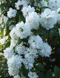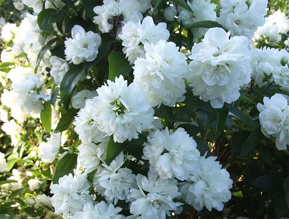 Чубушник Танечка. Куст широкий, прочный, в возрасте 10 лет высотой 1,7 метра. Цветки до 5 см, белые с лёгким зеленовато-кремовым оттенком, густомахровые. Соцветия крупные, шаровидной формы, в соцветии 7 цветков. Цветение потрясающе пышное. Аромат очень приятный.