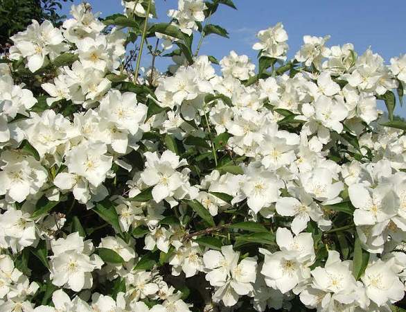 Чубушник Заснеженная Русь. Куст широкий, прочный. Цветки очень крупные, до 10 см, снежно-белые, простые с красивыми ромбовидными лепестками. Соцветия похожи на большие пышные букеты, в соцветии до 9 цветков. Аромат цветков лёгкий, невесомый. Цветёт потрясающе обильно. Красивый, превосходный сорт.