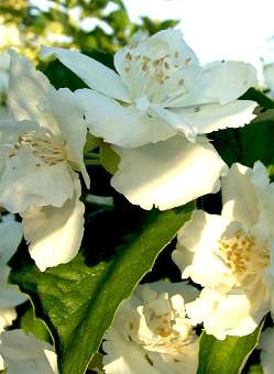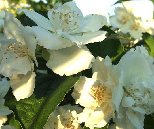 Чубушник Золотой Гигант. Куст широкий, прочный, в возрасте 10 лет высотой 2,5 метра. Цветки полумахровые, наружные лепестки крупные, округлой формы с зубчатым краем, а в центре цветка собраны немногочисленные изогнутые и кудрявые лепестки. Цветки очень крупные, до 8 см, в начале цветения золотистые, затем ярко-кремовые. В соцветии до 7 цветков. Аромат приятный, фруктовый. Цветёт обильно. Красивый монументальный сорт