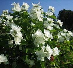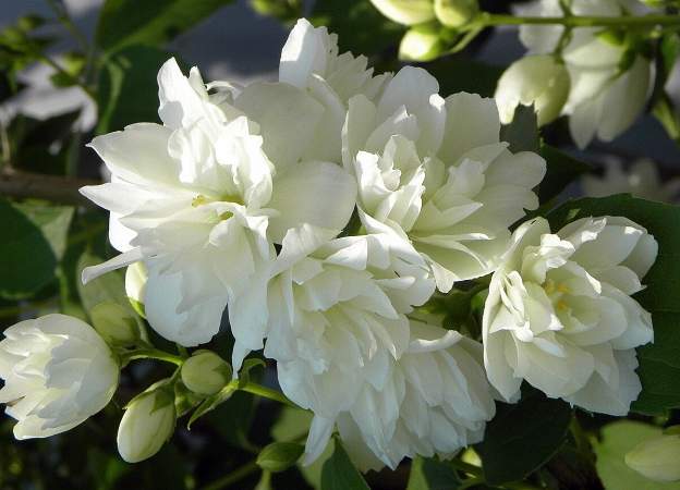 Чубушник Зоя Космодемьянская. Соцветия крупные, около 7 см, состоящие из 7-9 махровых крупных цветков. Последние имеют слегка зеленоватый оттенок, слабый, но необычайно тонкий аромат, в середине цветка есть тонкие изящные лепестки, придающие легкость цветкам. Куст широкий, густооблиственный, имеет шаровидную форму, нижняя часть куста не оголяется.