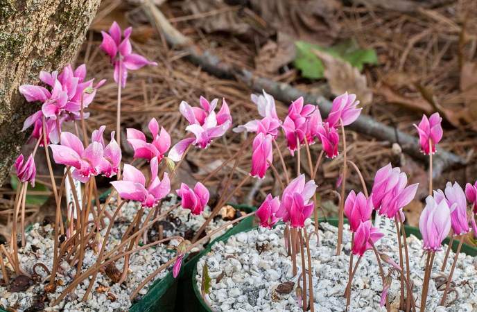 Цикламены хорошо смотрятся в альпийских горках и клумбах под кроной деревьев. Они эффектны в массовых посадках. Ковер из цикламенов можно создать на каменистом грунте или вблизи дорожек из камня.