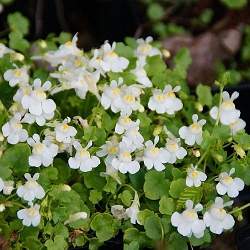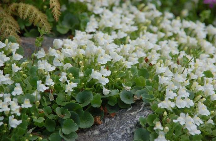 Цимбалярия постенная. Почвопокровное растение с хрупкими длинными стеблями, покрытыми мелкими листочками, с маленькими белыми цветочками, цветущими всё лето. Разрастается за счёт подземных побегов — столонов, листья округлые, сизовато-зелёные.