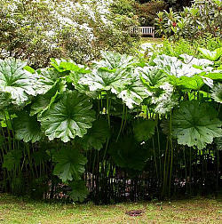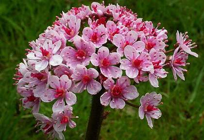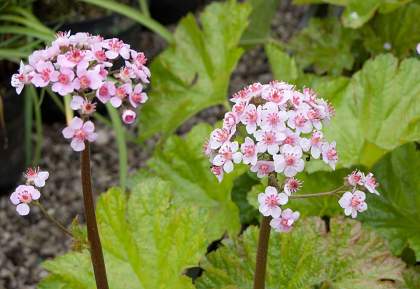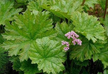 Дармера щитовидная. Дармера совершенно неприхотлива, предпочитает тенистые и влажные места, где она образует роскошные куртины, диаметр листа — около 50 см. Весной (в первой половине мая) дармера зацветает. При этом цветение представляет собой довольно экзотическое зрелище: на высоком крепком цветоносе, выходящем прямо из земли, располагаются полусферические соцветия, состоящие из множества розовых цветочков.