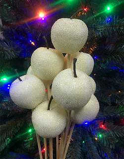 Декоративные белые яблоки на штекере в сахаре. Белые, сахарные, блестящие, довольно крупные яблоки на длинной деревянной палочке. Станут прекрасным дополнением к новогоднему декору — для украшения венков и гирлянд, композиций из лапника.