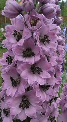 Дельфиниум Delphi's Misty (Делфиз Мисти). Цветки махровые, сиреневые с лавандовым оттенком и выразительным черным бархатным глазком. Высота до 150 см.