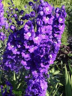 Дельфиниум Delphi's Power (Делфиз Пауэр). Цветки крупные, махровые, насыщенно-фиолетовые с белым глазком, собраны в плотное длинное соцветие. Эффектный высокий сорт (150 см). Цветет в июне-июле.