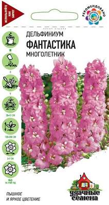 Дельфиниум Фантастика. Многолетнее растение семейства Лютиковые, высотой до 2 м с плотными кистевидными соцветиями нежно-розовых цветков. Цветет в июне-июле, вторичное цветение — в августе-сентябре, отцветшие соцветия обрезают для полноценного второго цветения. Хорошо растет на освещенных участках с легким затенением в полуденные часы. Предпочитает плодородные суглинистые и супесчаные, умеренно влажные почвы. Выращивают рассадным способом или прямым посевом в открытый грунт. Используются в групповых и одиночных посадках, для получения срезки. Все части дельфиниума ядовиты.