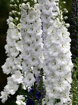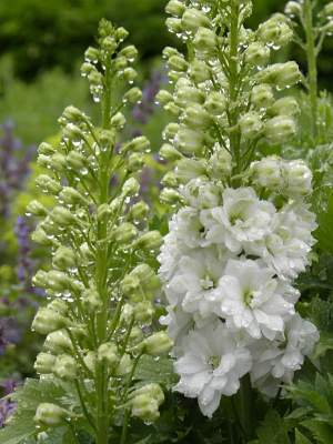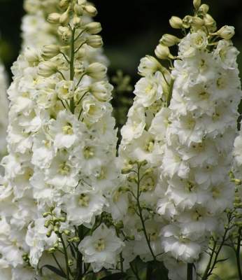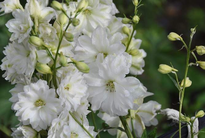 Дельфиниум Pacific Giant Galahad (Галахад). Цветки махровые, крупные, чисто-белые. Высокие стройные соцветия. Предпочитают супесчаную или суглинистую, богатую перегноем, умеренно влажную почву. Растение относительно засухоустойчиво, от сырости легко заболевает и выпревает.
