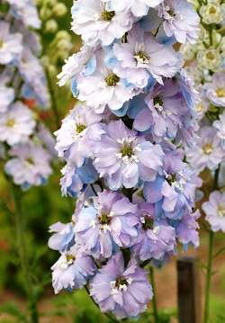Дельфиниум Gossamer (Госсамер). Прекрасный сорт с длинными плотными цветоносами. Цветки махровые, голубые с сиреневым, очень красивые. Весь колос как бы переливается.