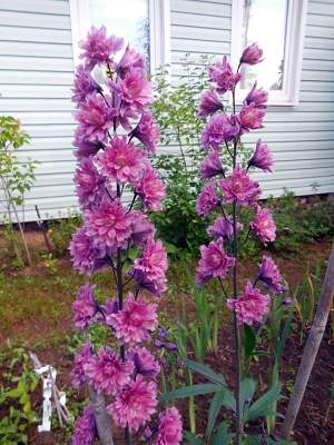 Дельфиниум Highlander Flamenco (Хайлэндер Фламенко). Дельфиниум имеет густомахровые цветки диаметром 5-6 см насыщенного пурпурно-лилового цвета. Листва пышная и зеленая, цветение обильное, начиная с середины июня, на прочных цветоносах.