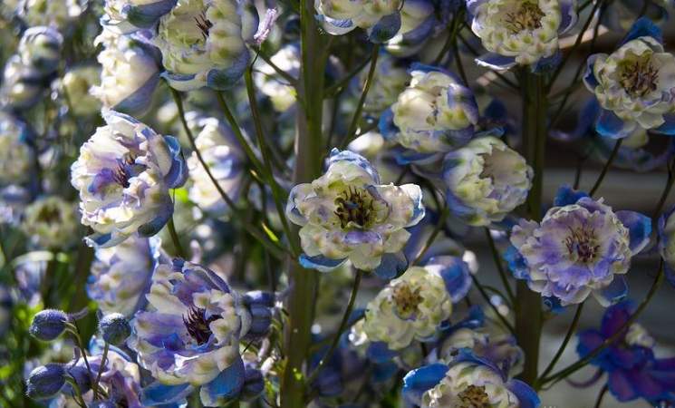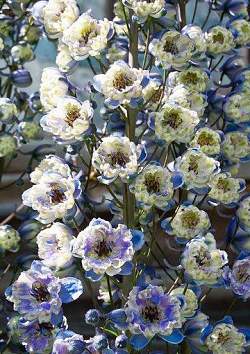 Дельфиниум La Boheme (Ла Богема). Самый необычный сорт дельфиниума высокого. Дельфиниум-хамелеон. Из фиолетово-синих бутонов открываются махровые, крупные, белые цветы с зеленым оттенком, внутри очень темный фиолетовый глазок. Цветок 5 см в диаметре. Высота растения 150 см.