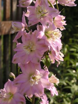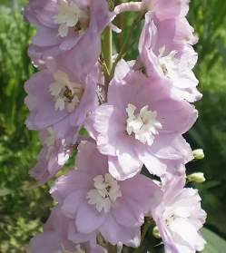 Дельфиниум Petticoat (Петтикоут). Красивый сорт с сиреневато-розовыми цветками, собранными в длинные колосья средней плотности. Серединка бело-кремовая. Высота до 100 см. листья светло-зеленые. Очень красив в сочетании с наперстянками абрикосового и белого цвета.