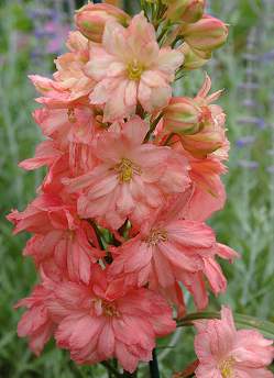 Дельфиниум Princess Caroline (Принцесс Кэролайн). Один из самых красивых сортов. Мощный цветонос достигает 180 см в высоту, из которых 60-70 см приходится на соцветие. Цветки сильномахровые, диаметром 6-8 см с персиково-розовыми лепестками.