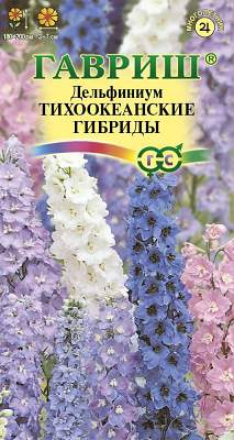 Дельфиниум Тихоокеанские гибриды смесь. Многолетнее растение семейства Лютиковые, высотой до 2 м с плотными кистевидными соцветиями розовых, темно-фиолетовых, синих, голубых, чисто-белых цветков. Цветет в июне-июле, вторичное цветение — в августе-сентябре, отцветшие соцветия обрезают для полноценного второго цветения. Хорошо растет на освещенных участках с легким затенением в полуденные часы. Предпочитает плодородные суглинистые и супесчаные, умеренно влажные почвы. Семена высевают осенью в открытый грунт или в марте на рассаду, в мае растения высаживают на постоянное место с расстоянием 35-40 см. Используются в групповых и одиночных посадках, для получения срезки. В срезанном виде стоят в воде до 10-12 дней. Все части дельфиниума ядовиты.