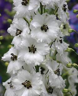 Дельфиниум White with Dark Bee (Уайт виз Дак Би). Цветки махровые, белые с эффектно черной бархатной серединкой. Высокие стройные соцветия. Предпочитают супесчаную или суглинистую, богатую перегноем, умеренно влажную почву. Растение относительно засухоустойчиво, от сырости легко заболевает и выпревает. Почвы с повышенной кислотностью необходимо известковать.