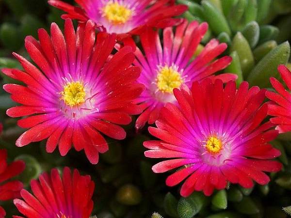 Делосперма Jewel of Desert Garnet (Джевел оф Десерт Гарнет). Небольшое многолетнее растение с распростертыми побегами, которые с начала лета украшают крупные цветы с тонкими лепестками, окрашенные в интенсивно-фуксиевые оттенки. Центр цветка имеет белое пятно, тычинки — медово-желтые.