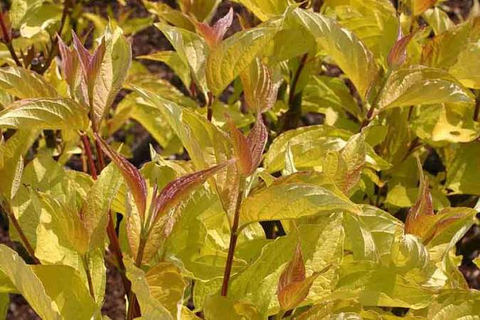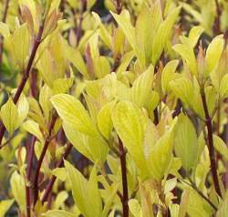 Дерен белый Aurea (Ауреа). Кустарник высотой 2-3 м, шириной кроны 3-5 м. Крона плотная, побеги тонкие, декоративные, кораллово-красные. Цветки белые, мелкие, собраны в щитковидные соцветия. Цветет в июне и повторно в конце лета. Плоды мелкие круглые ягоды. Листья крупные, золотисто-желтые, морщинистые. Лучшего развития достигает на солнечных или полутенистых участках.