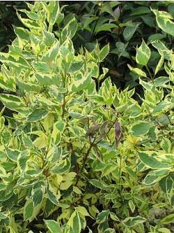 Дерен Cream Cracker (Крим Крекер). Высота до 1,5 м. Крона неплотная, с вертикальными пурпурно-красными побегами. Листья на молодых приростах с белой каймой по краю, у взрослых листьев кайма становится желтовато-кремовой.